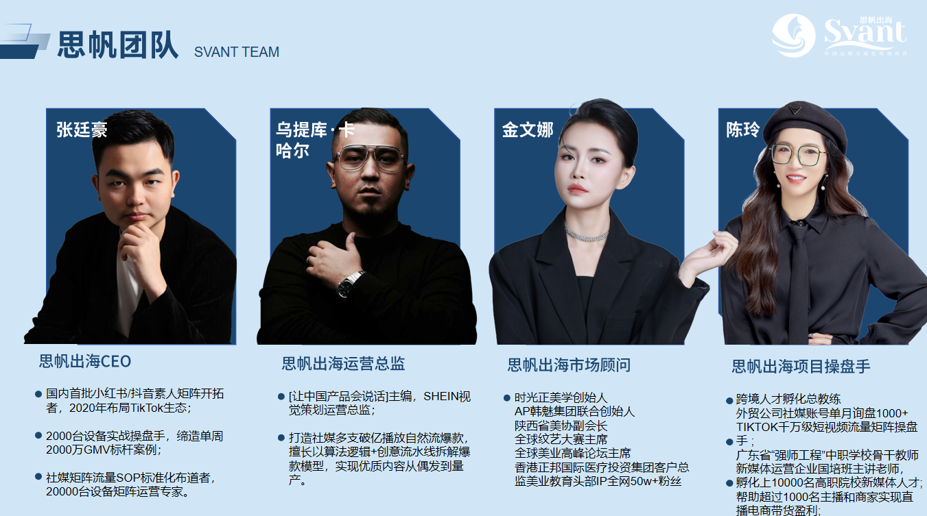 配备15年+专业SEO团队、独立站运营团队、跨境电商团队、全域社媒矩阵团队、产品开发设计团队、采购团队、财税团队及市场团队,全链路赋能品牌出海。