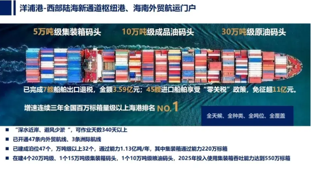 海南拥有四面环海的地理优势,洋浦港已开通25条航线,实现货物高效流转。